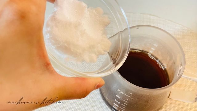 コーヒーを落とし終わったら、砂糖とゼラチンを加えます。