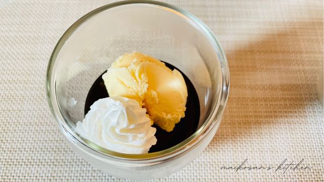 固まったらアイスとホイップクリームをトッピング
