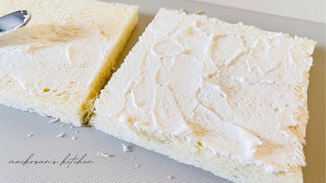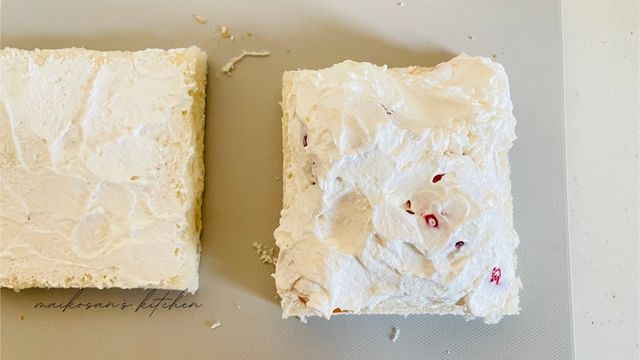 ラップで巻いて冷蔵庫で約1時間冷やすと、クリーム冷えて固まりカットしやすくなります。