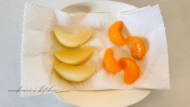 缶詰のフルーツは水分が多いので、キッチンペーパーなどで水分を拭き取ります。