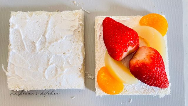 忠実に再現すると、断面にみかんと桃が必要なのですが、今回用意した苺が大きすぎて無理でした。