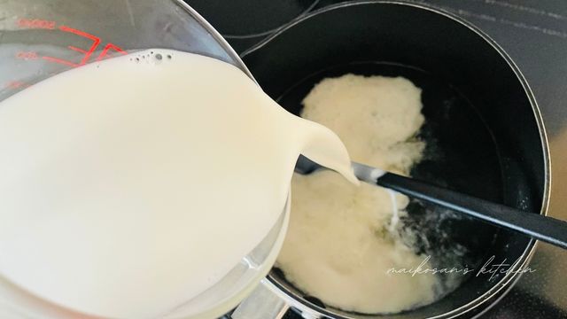 冷たい牛乳を入れると寒天が急に固まりやすいので、必ず人肌程度に温めてから!