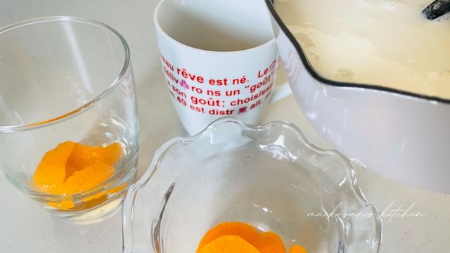 寒天液の粗熱が取れたら、みかん入りのカップにゆっくり注ぎ入れます。